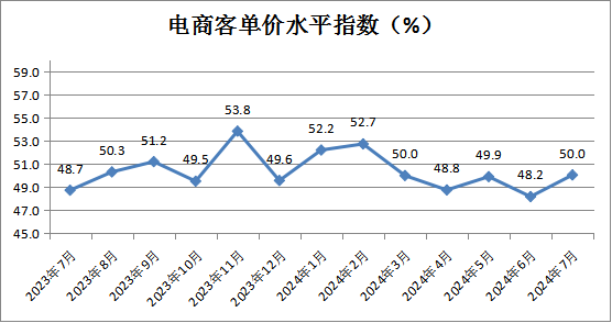 电商客单价水平指数为50.0%,较上月上升1.6个百分点。分析认为,7月电商客单价水平回升是年中电商促销活动结束,“薅羊毛”式消费占比下降的缘故。
