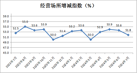 经营场所增减指数为51.8%,较上月小幅下降1.6个百分点,表明租赁经营类企业门店扩张趋势放缓。