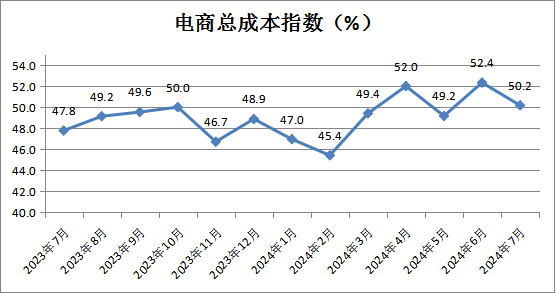 电商总成本反向指数为50.2%,较上月小幅下降1.2个百分点,表明电商经营类企业成本略有回升。