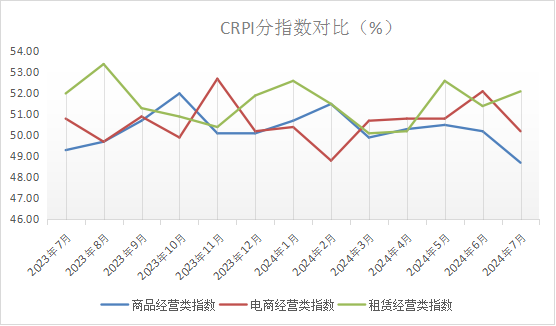 (一)CRPI三个分指数对比显示,7月份商品零售和服务零售增长趋势出现明显分化。反映商品零售状况的商品经营类指数和电商经营类指数同步下行。商品经营类指数降至临界点以下,表明线下商品零售渠道持续面临较大竞争压力。以服务零售为主的租赁经营类指数保持在中高位景气区间。